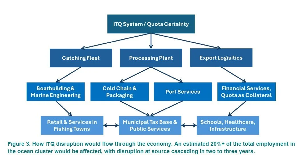 The secondary effects deserve explicit attention. The 12% GDP figure captures direct fishing and primary processing. It does not account for the cascade: boatbuilding and marine engineering whose order books depend on quota certainty; cold-chain logistics built around Icelandic processing volumes; port services; and the financial institutions that have lent against quota assets valued under the current framework. The ITQ system is not merely a fisheries management tool. It is the collateral base for a significant portion of commercial lending. Disruption to quota certainty, whether through CFP reallocation, ownership liberalisation, or competition law challenge, would transmit through the credit system into the broader economy. The fishing towns of the Westfjords and East Iceland are not coastal communities that happen to fish. They are economies in which virtually every job traces back, within one or two links, to the boat.