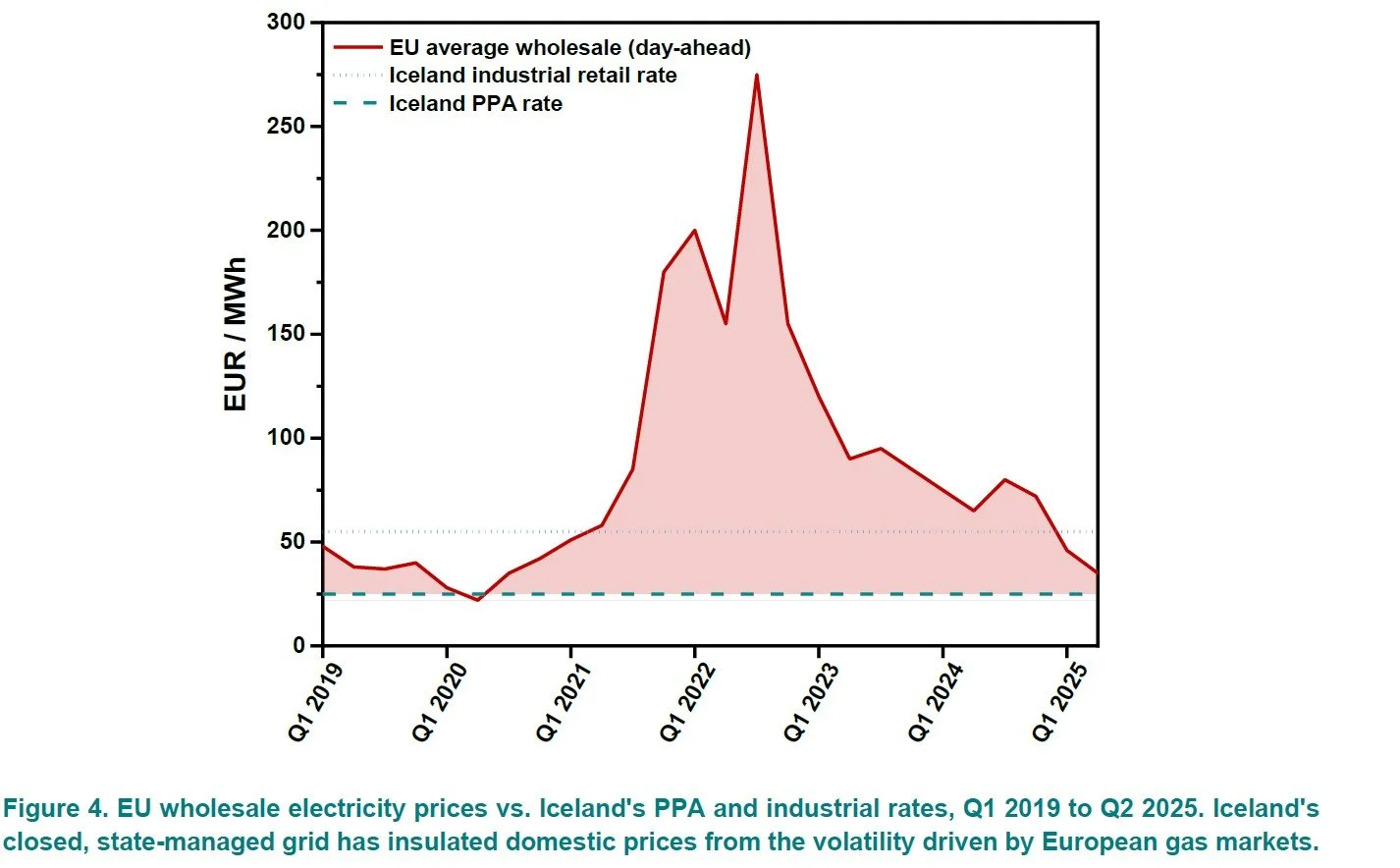 There is a further dimension that has received no attention at all. Iceland's 100% renewable electricity system has, to date, insulated Icelandic consumers and industry from the fossil fuel price volatility that has battered the rest of Europe. EU wholesale electricity prices averaged approximately USD 90/MWh in the first half of 2025, around 30% higher than the same period in 2024, driven in large part by elevated natural gas prices. Price spikes above EUR 150/MWh occurred in 9.3% of hours in 2025. The ACER monitoring report found that EU wholesale prices remain higher and more volatile than pre-crisis levels