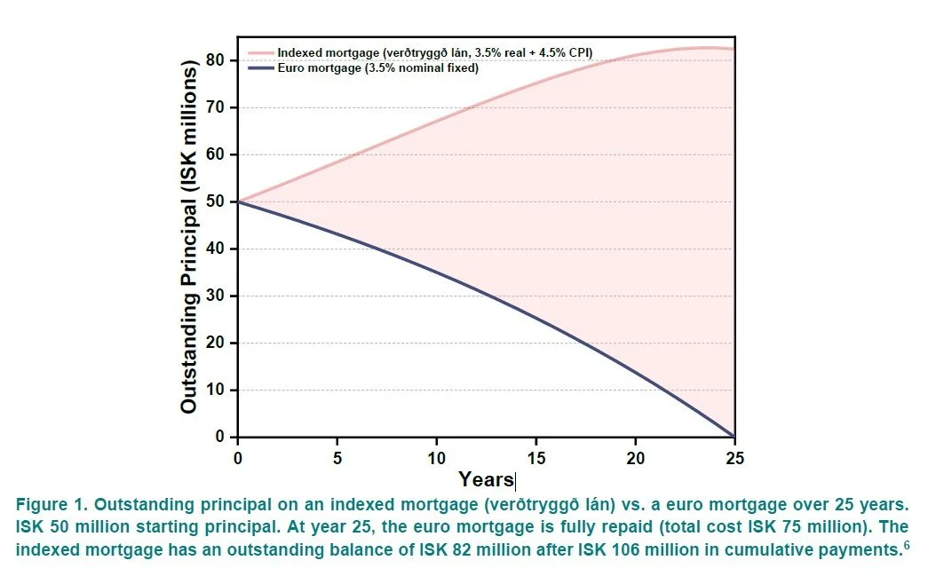 Euro adoption would not merely reduce the rate; it would eliminate indexation entirely. The difference over the life of a loan is substantial. After 25 years of payments on a euro mortgage at 3.5% fixed, the household has paid ISK 75 million and the loan is fully discharged. After the same 25 years on an indexed mortgage, the household has paid ISK 106 million and the outstanding principal stands at ISK 82 million, exceeding the original loan amount. The indexed mortgage has a further fifteen years of payments remaining.