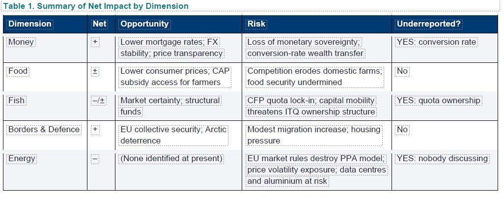This assessment has identified issues in each dimension that have received insufficient public attention: the interaction between indexed mortgages and euro adoption; the conversion rate as a one-time wealth transfer mechanism whose outcome depends on political negotiation, not economic optimality; the vulnerability of the ITQ ownership structure to EU capital mobility and competition law; the cascade through secondary industries that depend on quota certainty; and the incompatibility between Iceland’s state-managed PPA model and EU internal energy market rules. Each of these issues is navigable. None of them will navigate themselves.