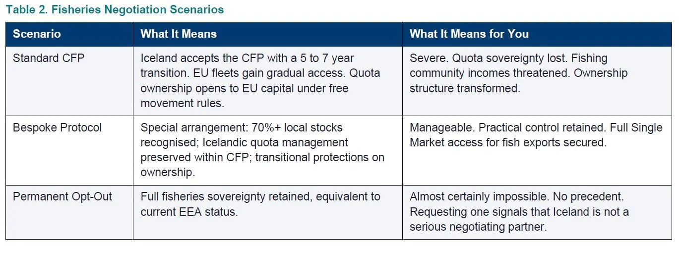 Each of these positions is defensible. None will be conceded without something in return. The negotiation is not a petition; it is a trade. Understanding what the Commission and the established fishing member states need from an Icelandic accession (stable North Atlantic stock management, a precedent that does not unravel existing CFP arrangements, access to Icelandic processing expertise) is the prerequisite for constructing a proposal they can accept. The UK’s departure removes the hardest opponent from the table. That advantage is structural but not permanent. The analytical work should be under way before the ballot papers are printed.