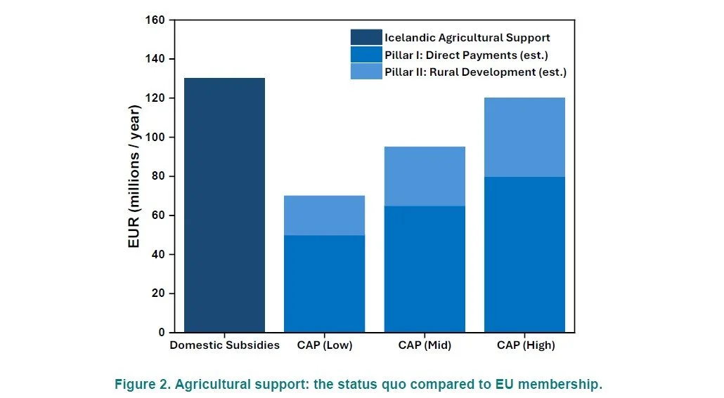 Quantifying likely CAP receipts requires assumptions, but the order of magnitude is instructive. Iceland has approximately 3,800 farms and 1.9 million hectares of agricultural land, mostly rough grazing. Under the 2023–2027 CAP framework, direct payments averaged approximately EUR 267 per hectare across the EU. Even at half the average rate on actively farmed hectares, Pillar I payments could reach EUR 50 to 80 million annually, with Pillar II adding EUR 20 to 40 million. For context, Iceland’s current agricultural subsidies total approximately EUR 130 million per year. CAP participation would shift part of this base from the Icelandic taxpayer to the EU budget, resulting in significant saving for Icelandic taxpayers. The final amount even be higher, depending on the outcome of negotiations.